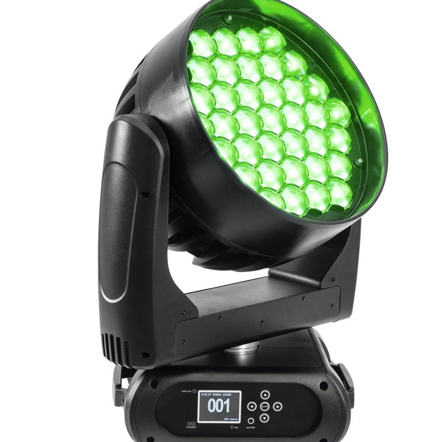 LED-Washmovinghead mit 37 RGBW LEDs und Zoom. Verschiedene Ansteuerungsmöglichkeiten dank variablen Mustereffekten auf den LEDs.