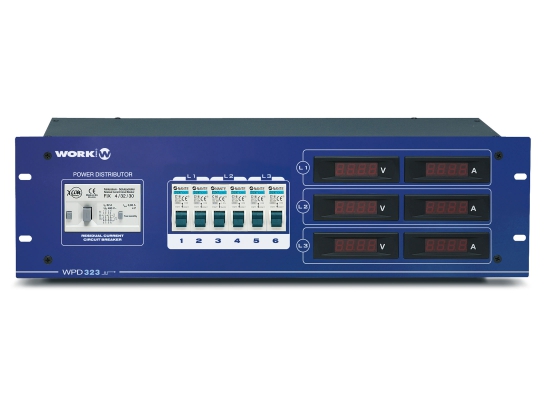 Der WORK WPD 323 STUV ist ein 32A Stromverteiler mit FI und Automatensicherung. Er hat einen 16A-Drehstrom-Ausgang und 6 16A-Schuko Ausgänge. Zusätzlich werden pro Phase aktuelle Spannung und durchfließender Strom angezeigt.